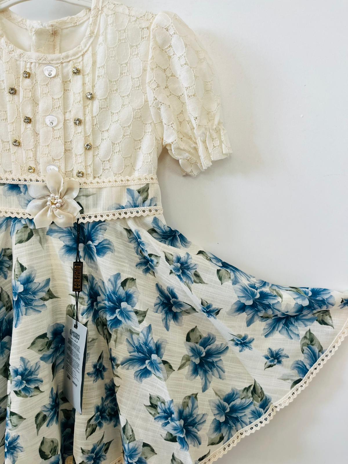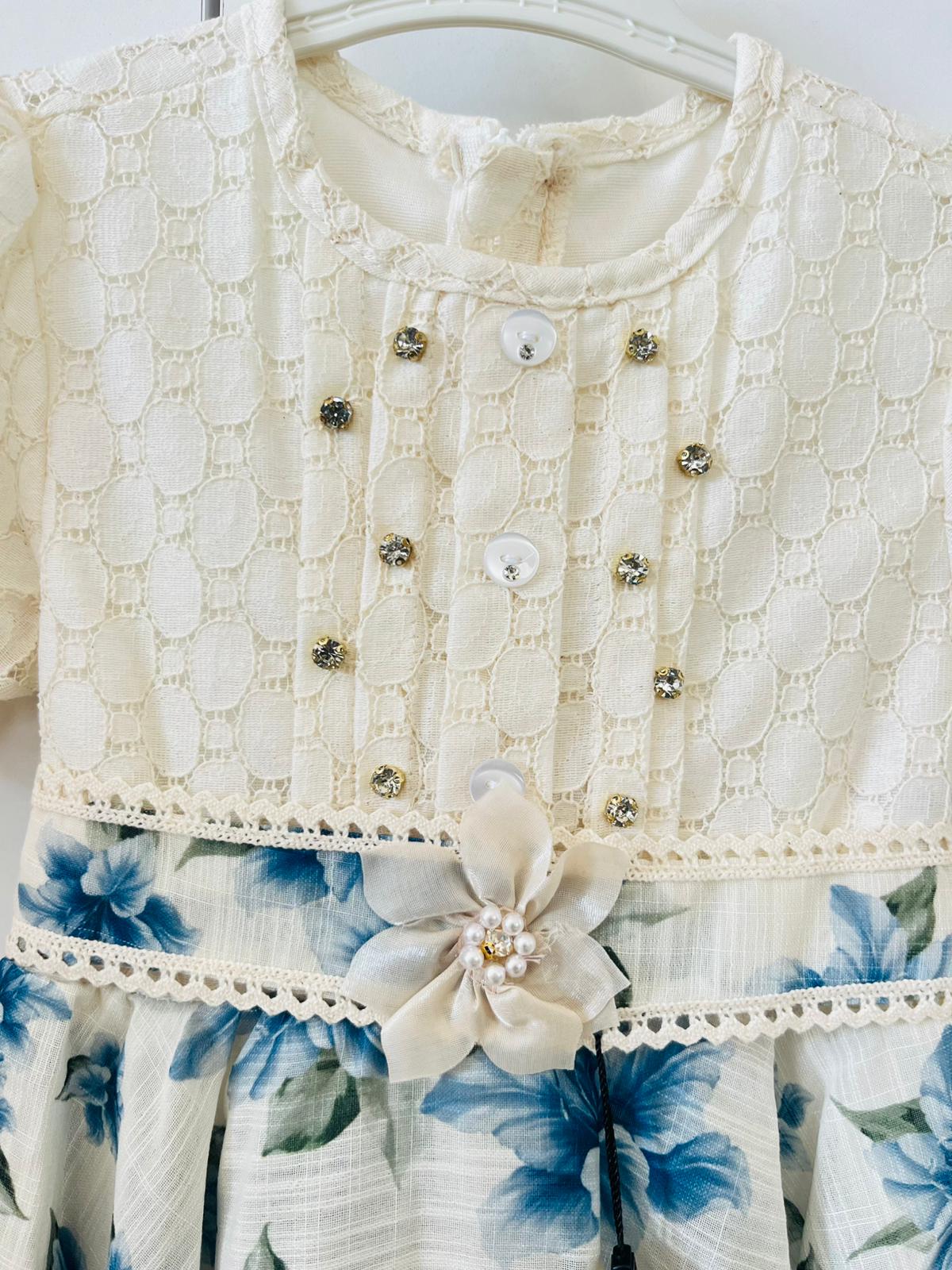 Üstü dantelli beli bağlanabilen eteği mavi çiçekli elbise.
