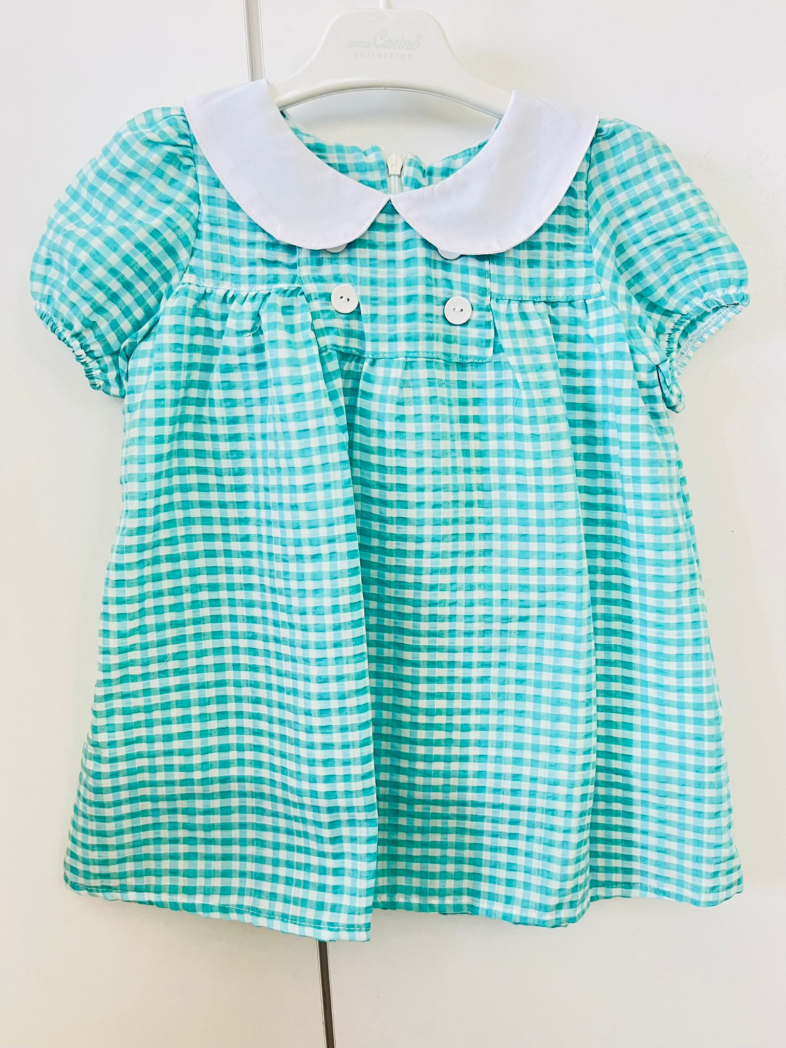Turkuaz renkli beyaz bebek yaka pötikare elbise.