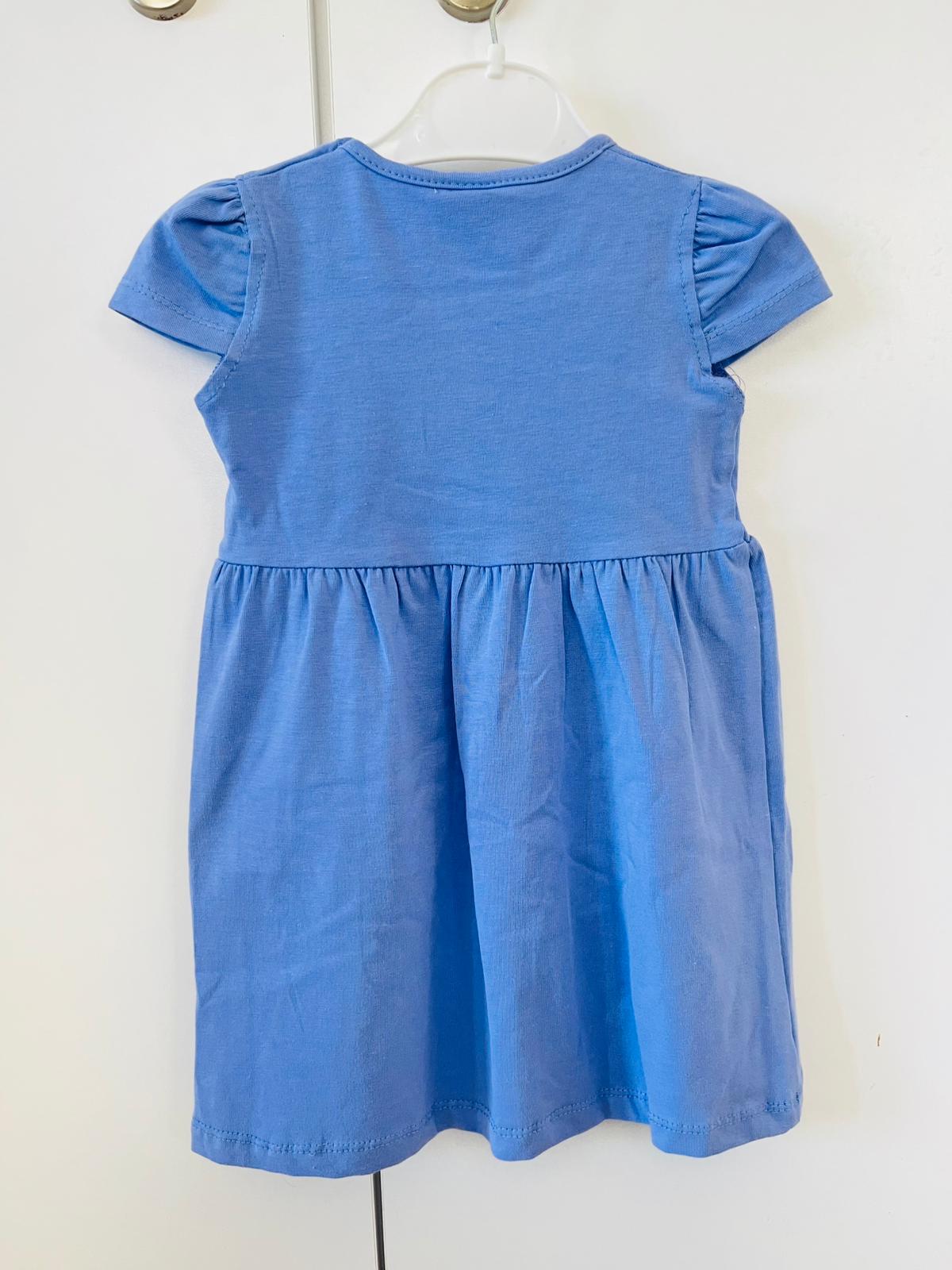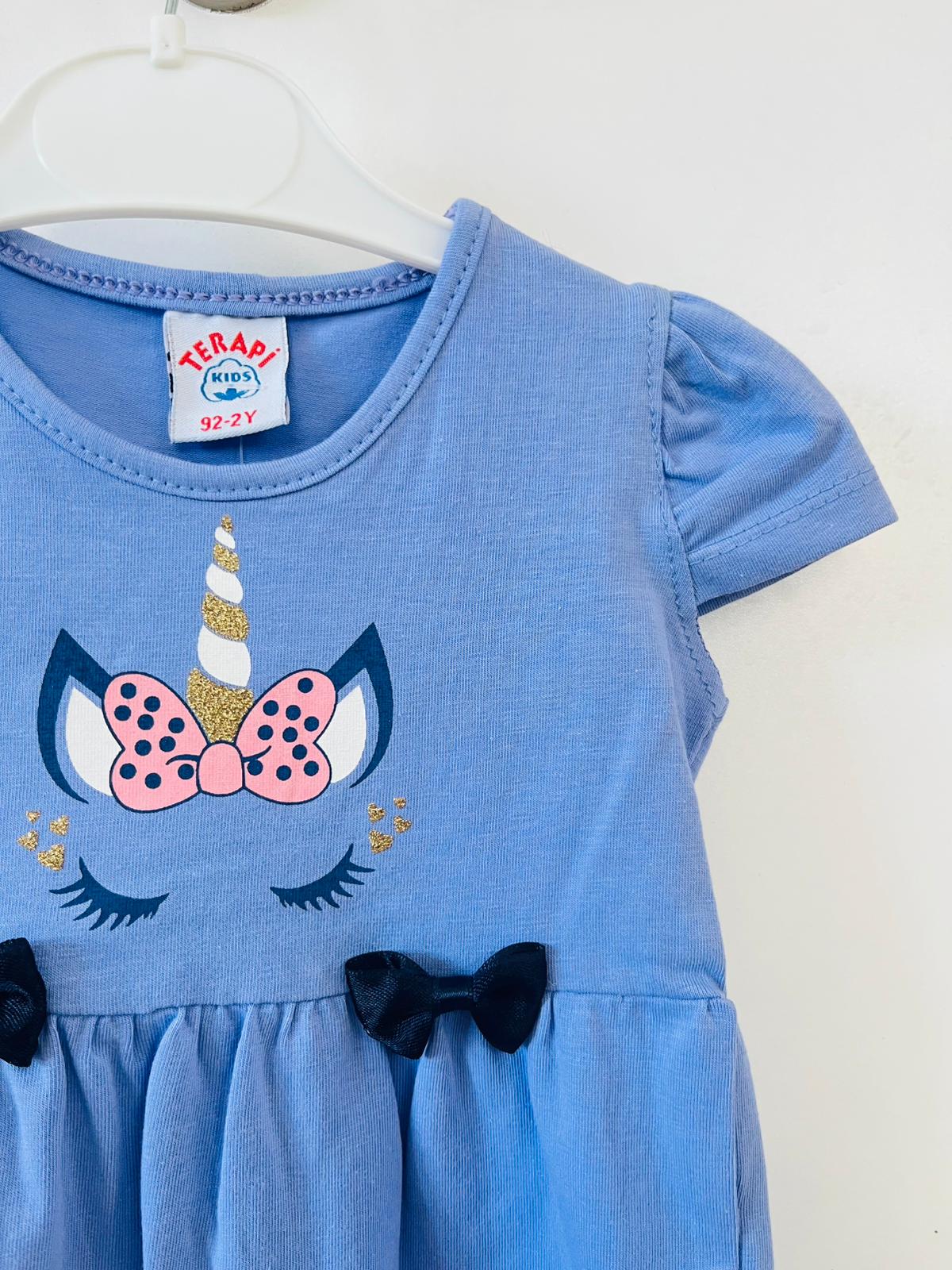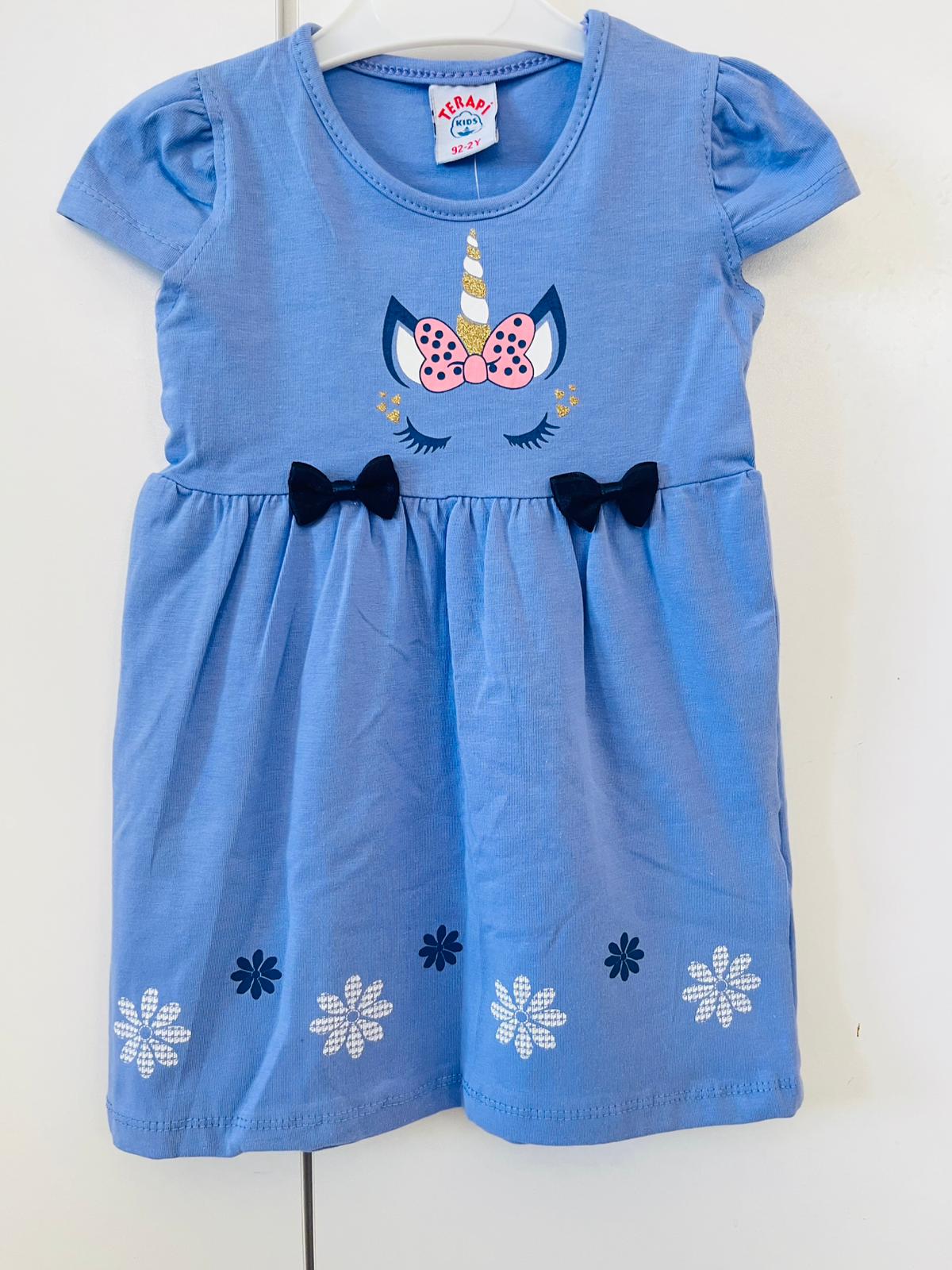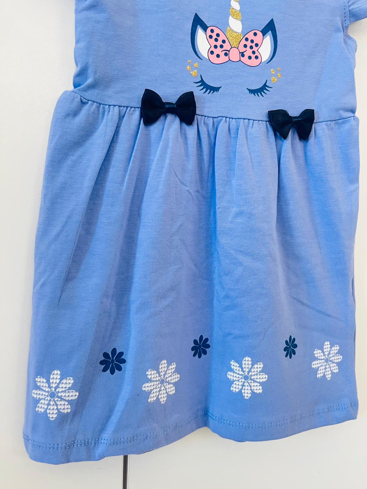 mavi unicorn fiyonk detaylı eteği çiçekli elbise.